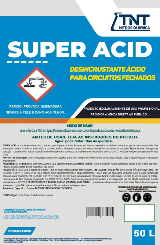 Super Acid é um desincrustante ácido, de uso profissional, indicado para limpeza de linhas fechadas em diversos segmentos de indústrias alimentícias. Sua formulação possui baixa ação espumante e a combinação de ácidos facilita a limpeza de resíduos inorgânicos nas linhas de produção.