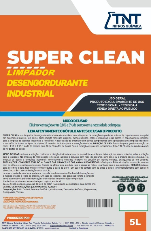 Super Clean é um limpador desengordurante a base de amoníaco com alto poder de remoção de gorduras e óleos de origem animal e vegetal em superfícies laváveis, como pisos (exceto madeira), azulejos, mesas, balcões, coifas e utensílios, entre outros.